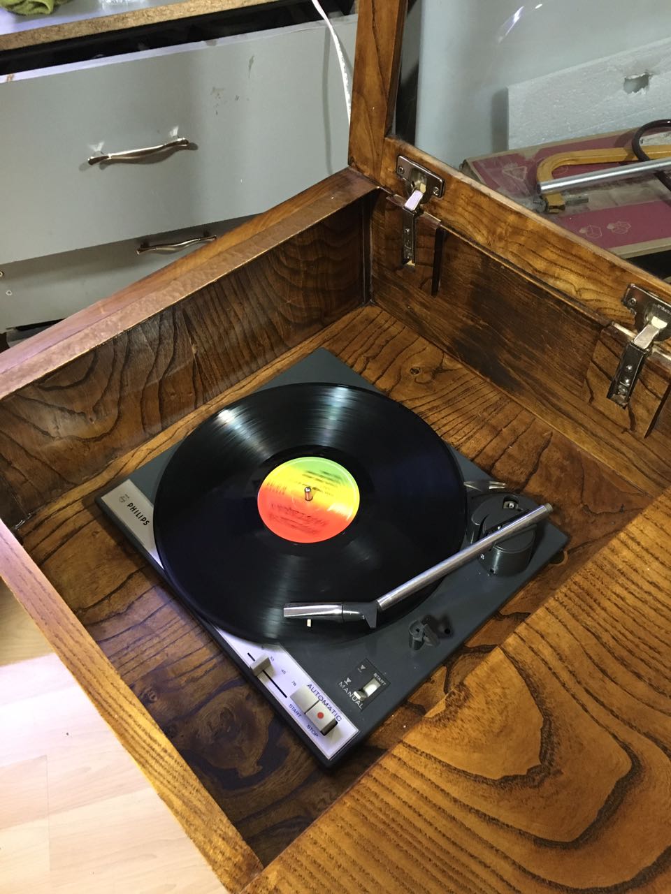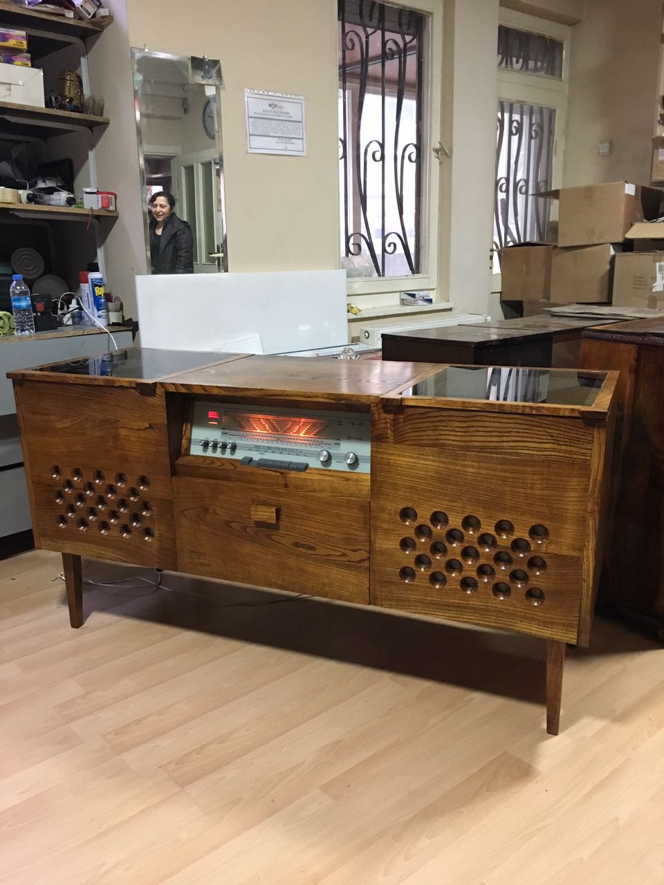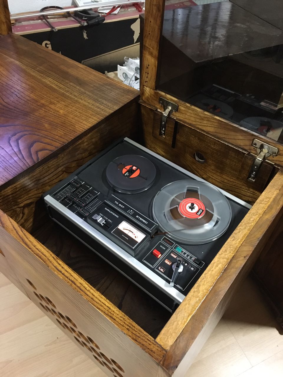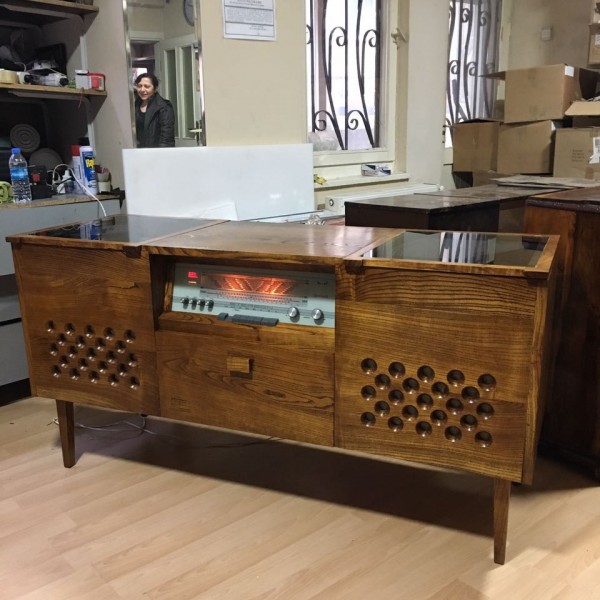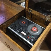stereo console.. mulberry.. contents: record player, tape recorder and radio..