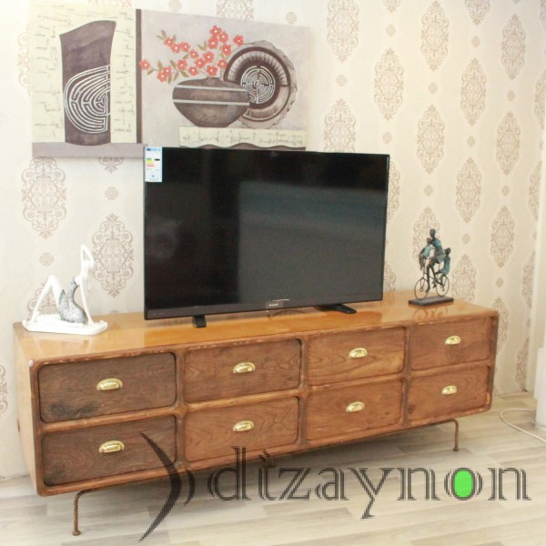 gövde masif cevizden, çekmece kapakları 130 yıllık kestane parçalardan zamanın aşındırıcı etkileri korunarak üretilmiştir.. tv ünitesi, konsol ve şifoniyer olarak çok uzun yıllar kullanılabilecek tamamen el işçiliği bir üründür.. uzunluk: 202cm, yükseklik: 68cm, derinlik: 56cm