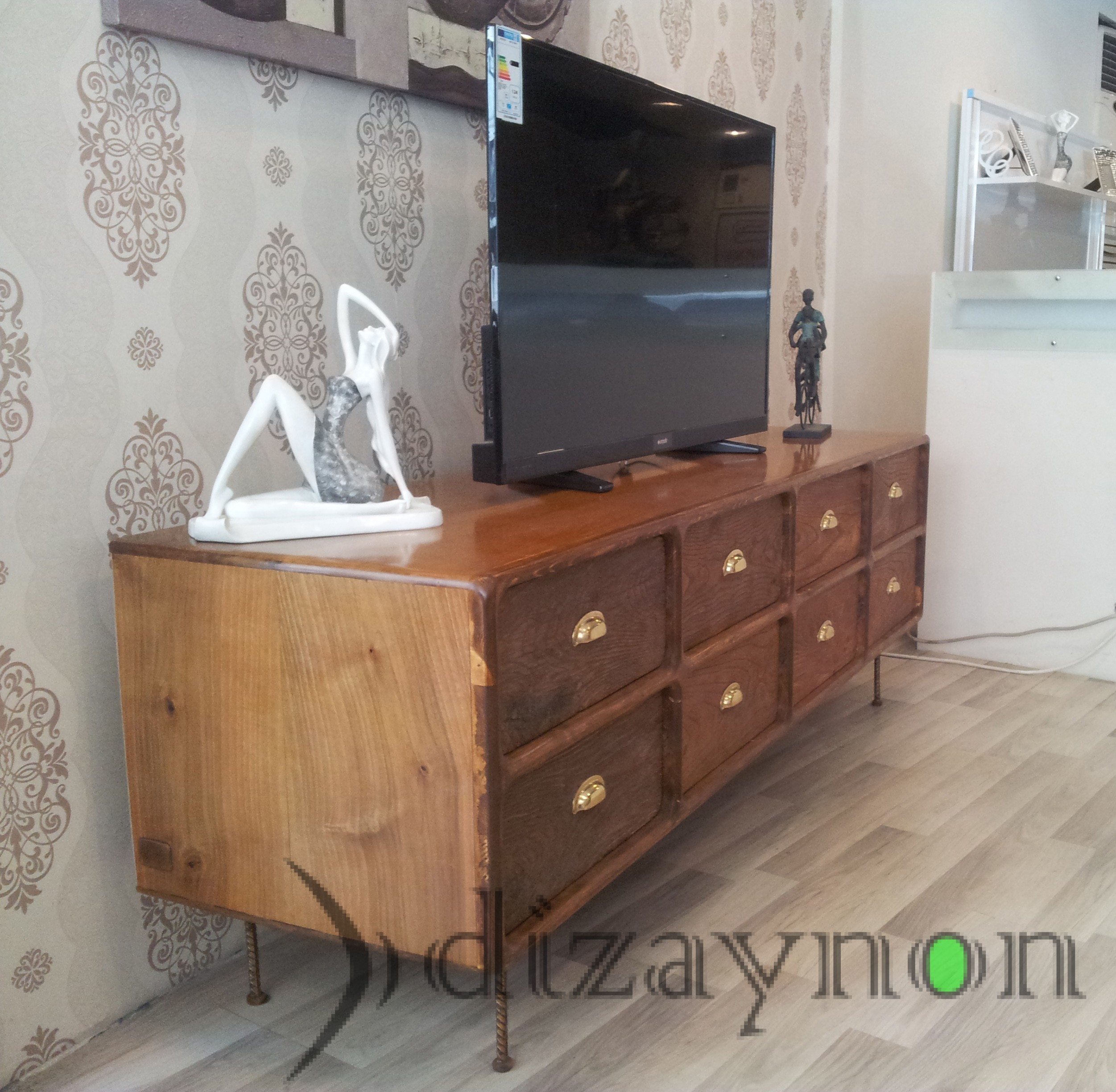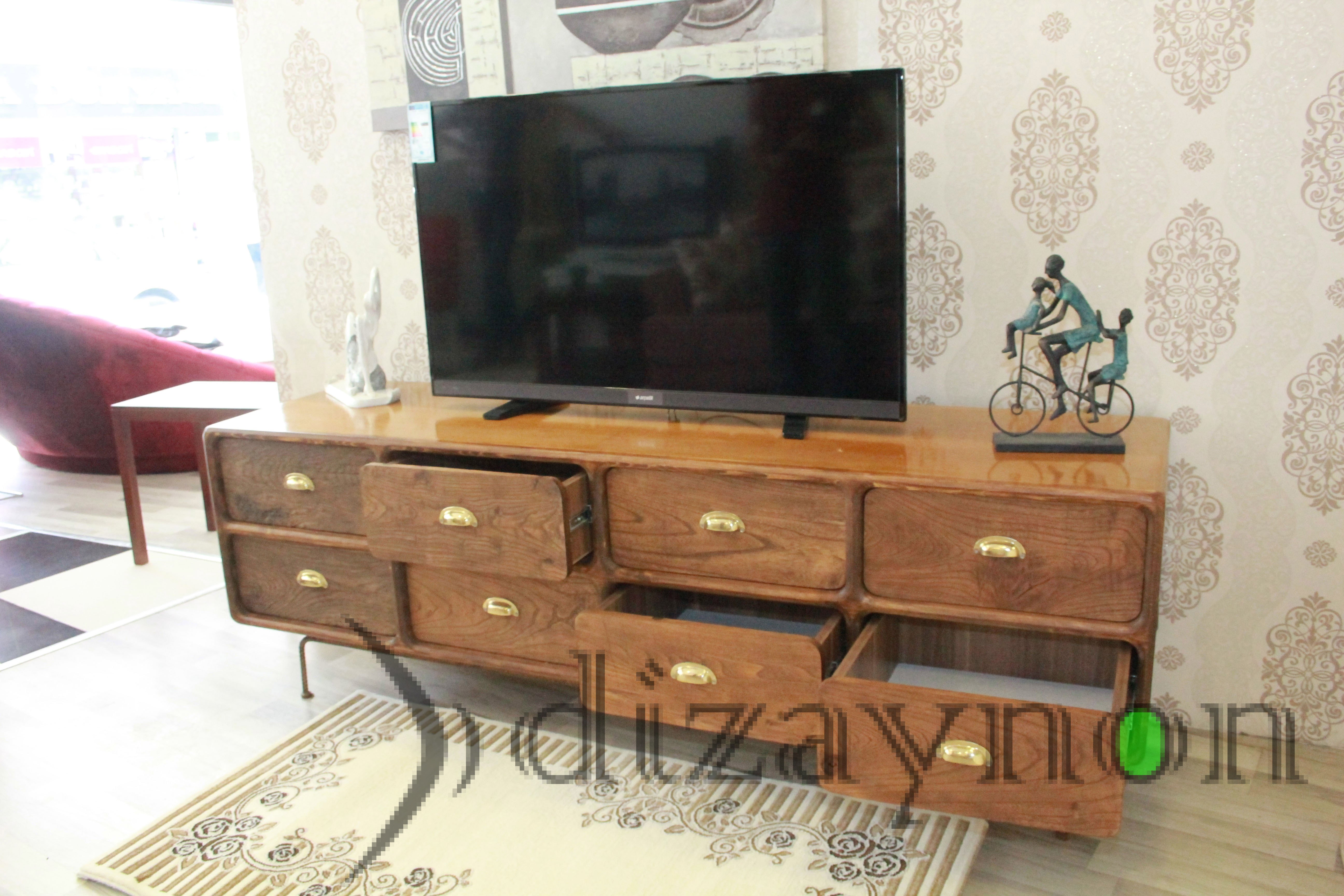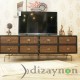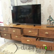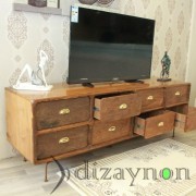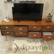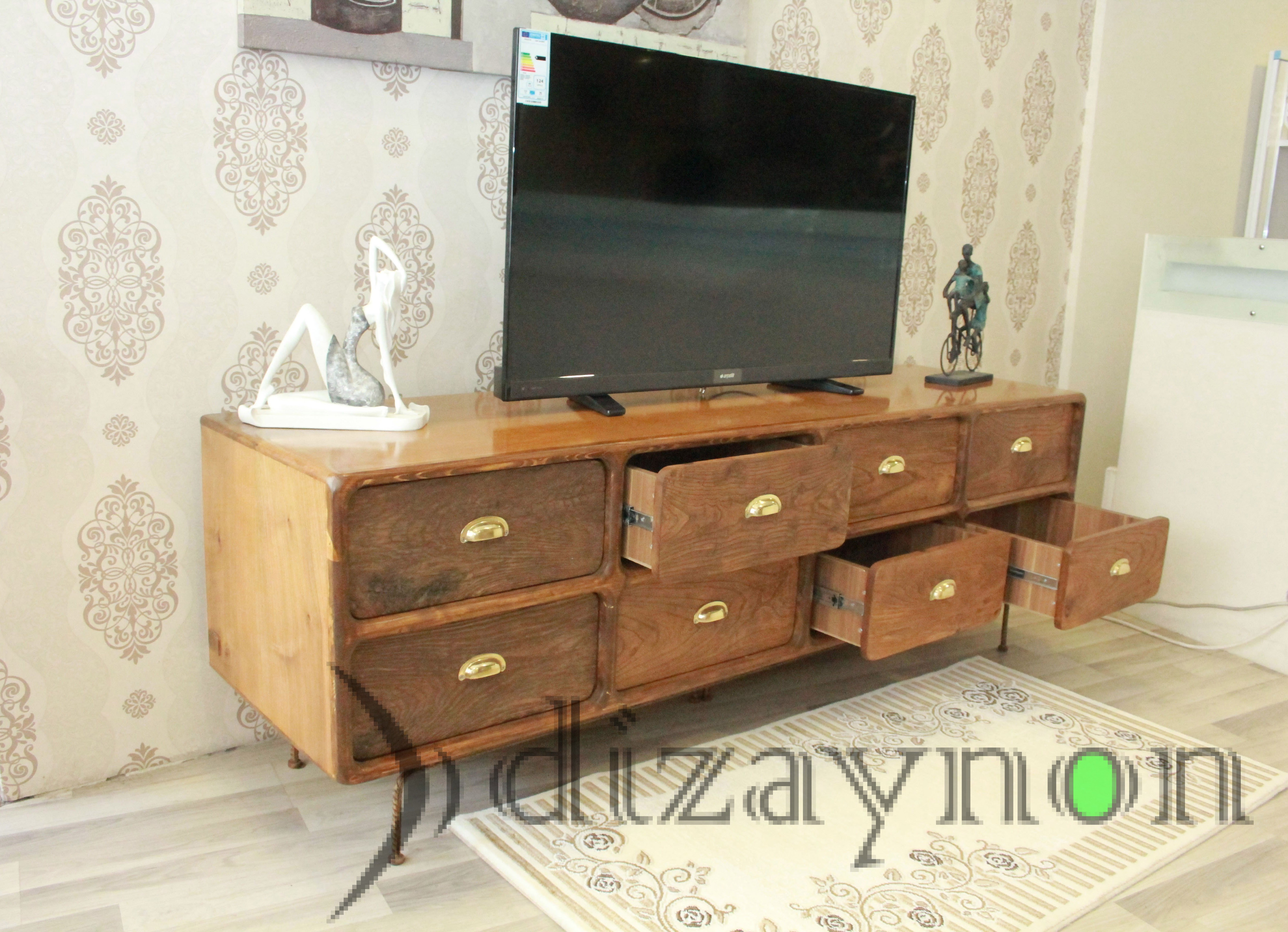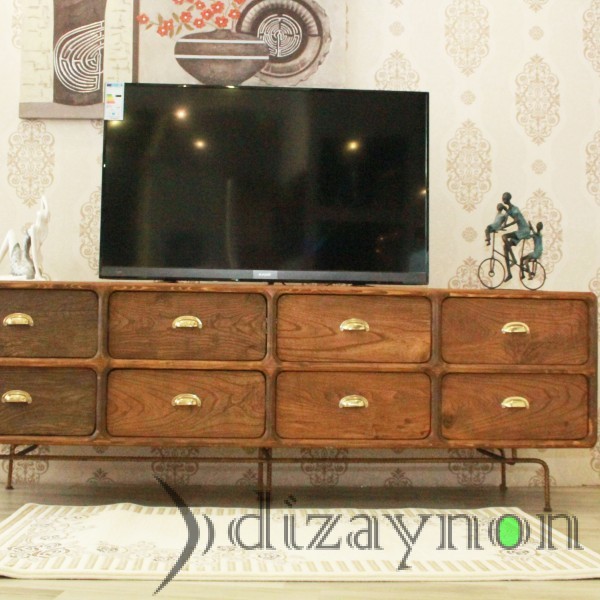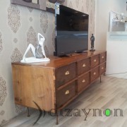 The body was made of solid walnut, and the drawer fronts are of 130 year old chestnut timber, manufactured with care to maintain the marks of wear it acquired through time. This TV unit is a fully hand-made product which can also serve for many years, as a console table and a chiffonier.. length: 202 cm, height: 68 cm, width: 56 cm
