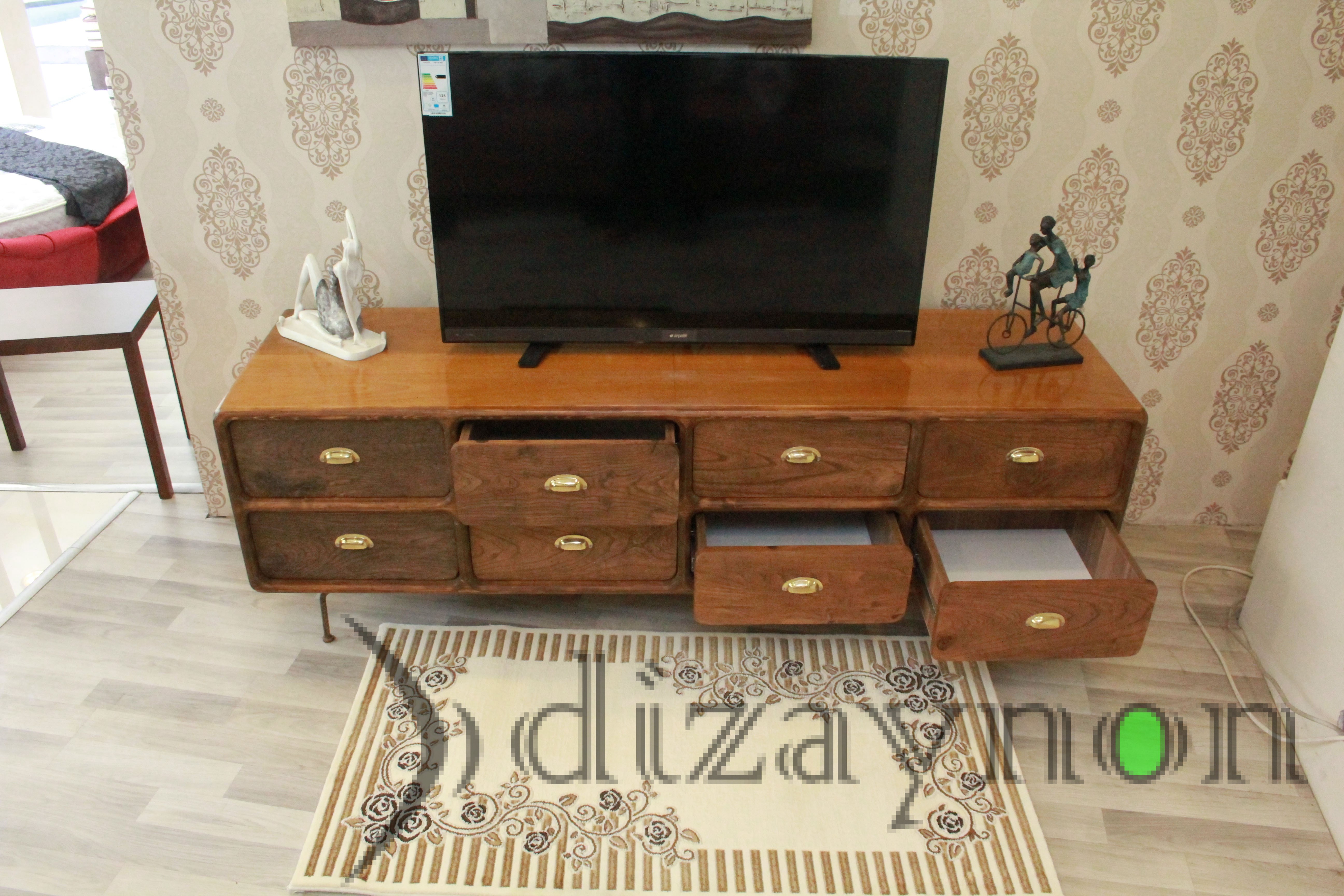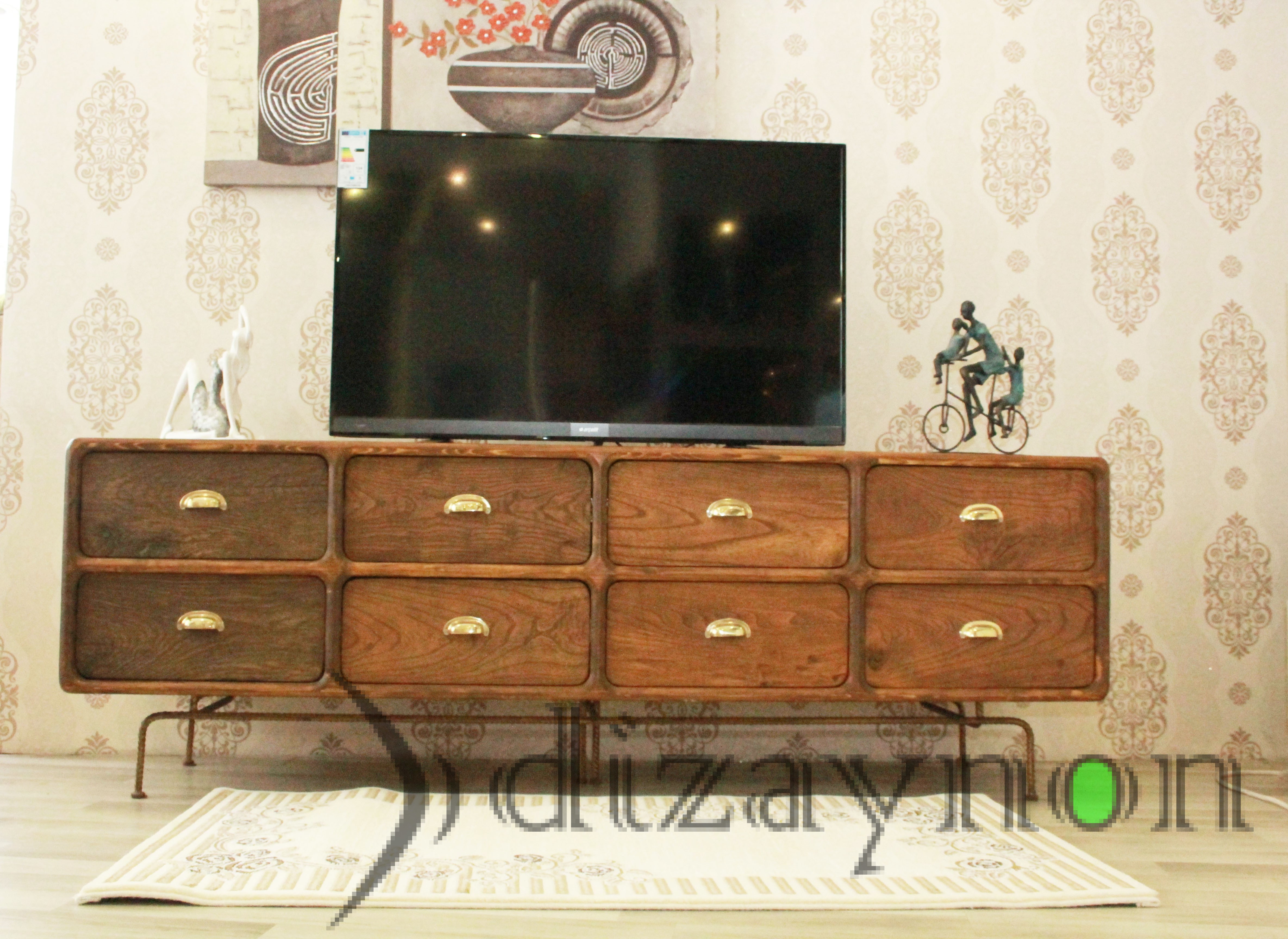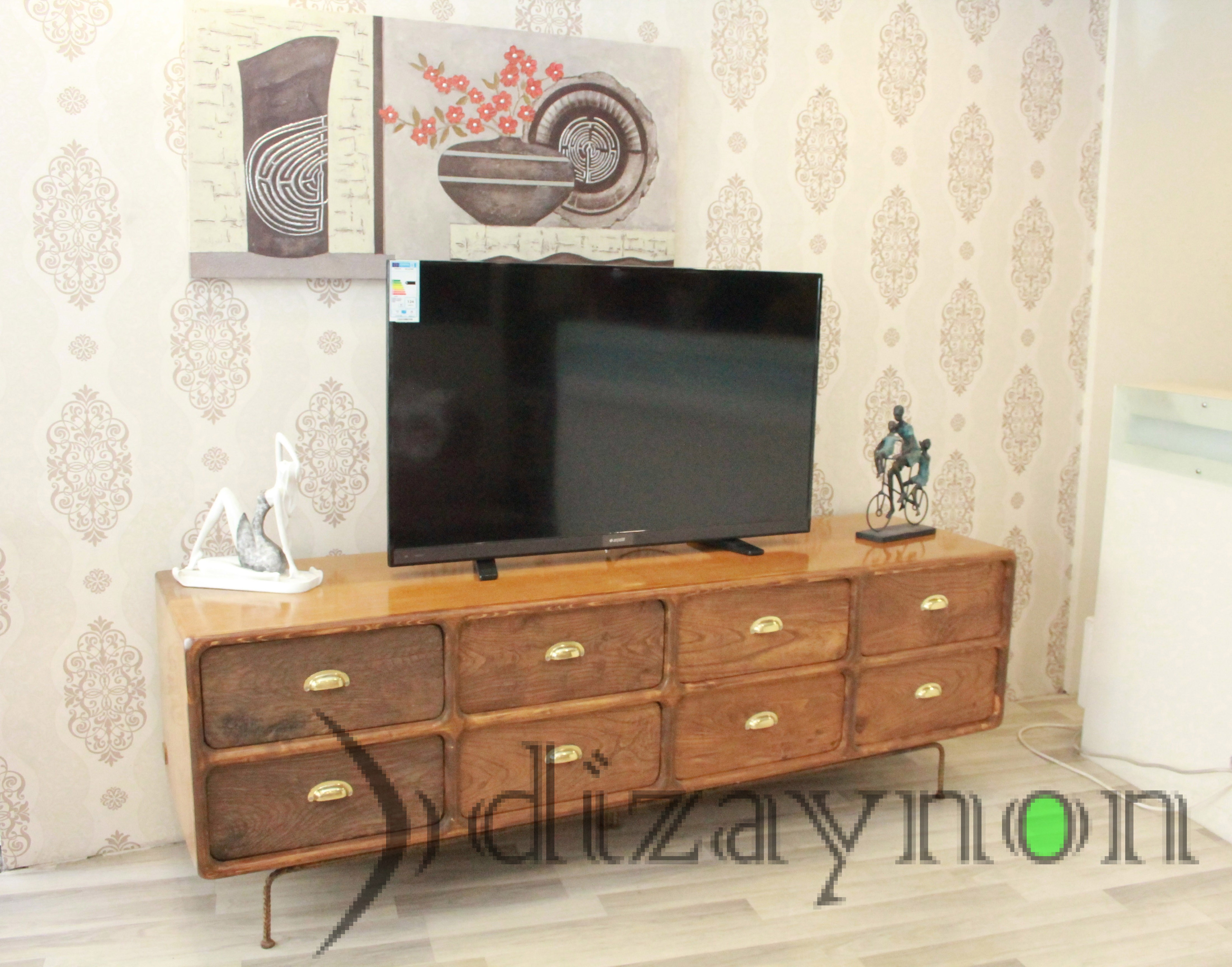 The body was made of solid walnut, and the drawer fronts are of 130 year old chestnut timber, manufactured with care to maintain the marks of wear it acquired through time. This TV unit is a fully hand-made product which can also serve for many years, as a console table and a chiffonier.. length: 202 cm, height: 68 cm, width: 56 cm